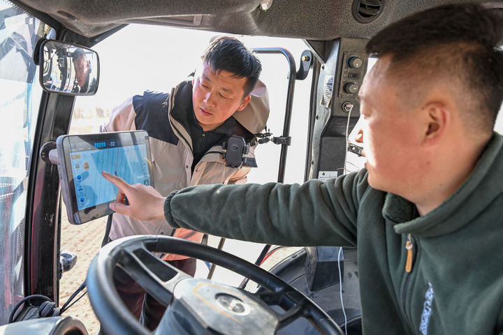 2026年3月24日,正在新疆伊犁哈萨克自治州察布查尔锡伯自治县孙扎齐牛录镇,罗俊杰(左)和农机手查看斗极从动系统确定播种地块。记者 丁磊 摄。