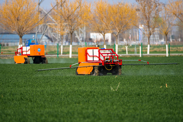 2026年3月9日,肥城市安驾庄镇洼里无人聪慧农场内,由山东农业大学团队自从研制的喷药机械人正在喷洒农药。记者 朱峥 摄。